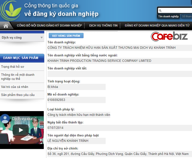 Kiểm tra mã số thuế này trên Cổng thông tin quốc gia về đăng ký doanh nghiệp (Bộ Kế hoạch và Đầu tư), công ty bắt đầu thành lập từ năm 2014, người đại diện pháp luật là ông Lê Nguyễn Khánh Trình . Tình trạng hoạt động của công ty: Bị khóa.