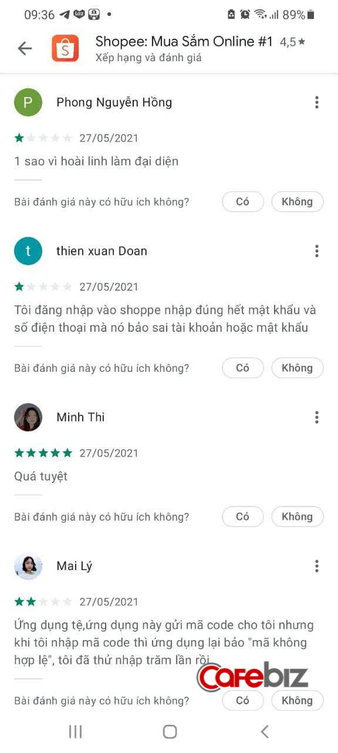 Sự phẫn nộ của đám đông không chỉ dừng lại ở fanpage chính thức Shopee, người dùng ứng dụng thậm chí còn đánh giá 1 sao trên các chợ ứng dụng. Trên App store và Google Play, ứng dụng của Shopee nhận được nhiều đánh giá 1 sao hoặc bình luận sẽ gỡ ứng dụng này vì lý do liên quan đến hình ảnh của nghệ sĩ Hoài Linh.