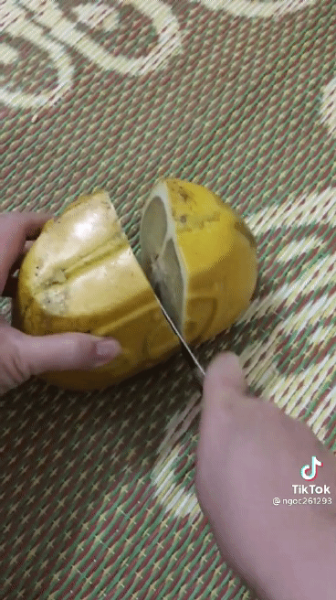 Mới đây, hai tài khoản tiktok đã đăng tải quá trình bổ hai loại quả này, thu hút hàng chục nghìn đến cả triệu lượt xem. Trong đoạn clip ngắn, quả bưởi hình thỏi vàng được chủ nhân "xử lý" có múi tương tự như các trái thông thường. Tuy nhiên, theo quan sát, các múi đều rất nhỏ, tép bưởi mỏng.