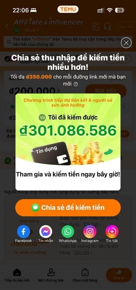“ Chỉ sau một tiếng chia sẻ link Affiliate từ Temu, Q. đã kiếm ngay 5 triệu đồng, chưa kể mọi người mua hàng trên app em cũng được hoa hồng đơn hàng từ 10-30% nữa ”, tài khoản N.Q cho hay.