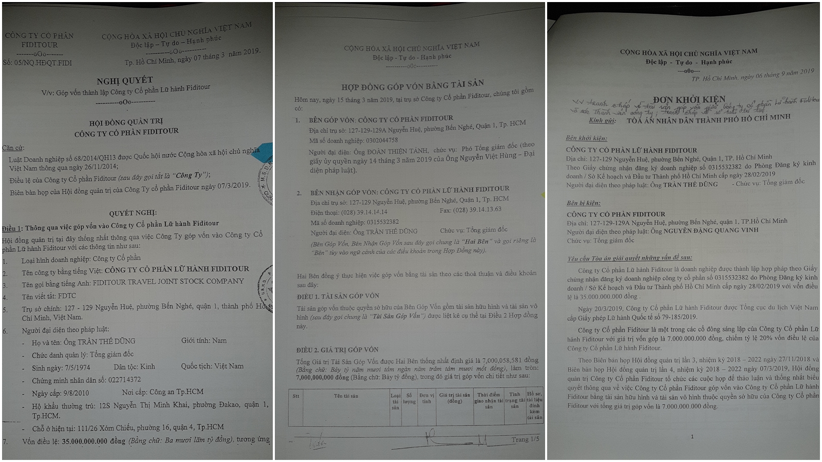 Đến ngày 7/3/2019, đã có 8/9 thành viên HĐQT công ty CP Lữ hành Fiditour đồng ý thông qua Nghị quyết góp vốn thành lập công ty CP Lữ hành Fiditour bằng tài sản, giá trị là 7 tỷ đồng”, ông Dũng nói.