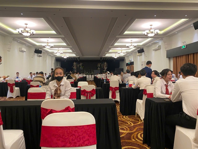 Khi chúng tôi đọc tên Kim Xuyến, người này ậm ừ vì không biết Xuyến là ai nên đã yêu cầu cung cấp tin nhắn đã trao đổi với Xuyến để xác nhận. Lúc này, chúng tôi mới được dẫn vào phía trong, nơi đang có hàng trăm nhân viên đang ngồi tư vấn cho khách. Nhạc Tết mở to để lấn át tiếng ồn, nhốn nháo.