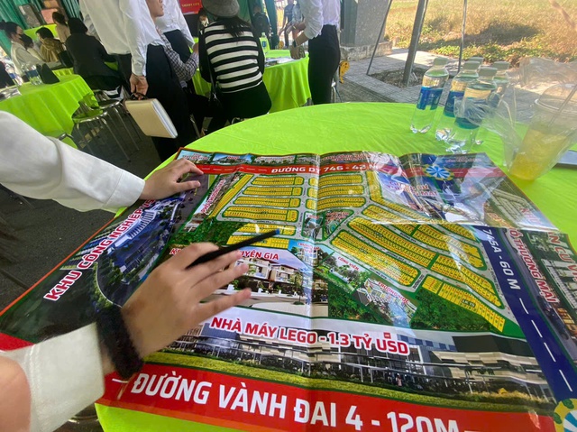 Sau hơn 1,5 giờ di chuyển, chúng tôi được đưa đến xem đất nền tại chợ Tân Lập - chợ VSIP 3 (huyện Bắc Tân Uyên, tỉnh Bình Dương). Đây là một khu đất trống, được dựng rạp với nhiều bàn ghế, tiếng nhạc ầm ĩ với rất đông nhân viên và khách hàng liên tục hò hét "chốt cọc rồi", "đã cọc 100 triệu", "chị Mai mua lô đây rồi". Nhiều khách hàng ngồi ký giấy tờ, đếm tiền để đặt cọc rất nhộn nhịp...