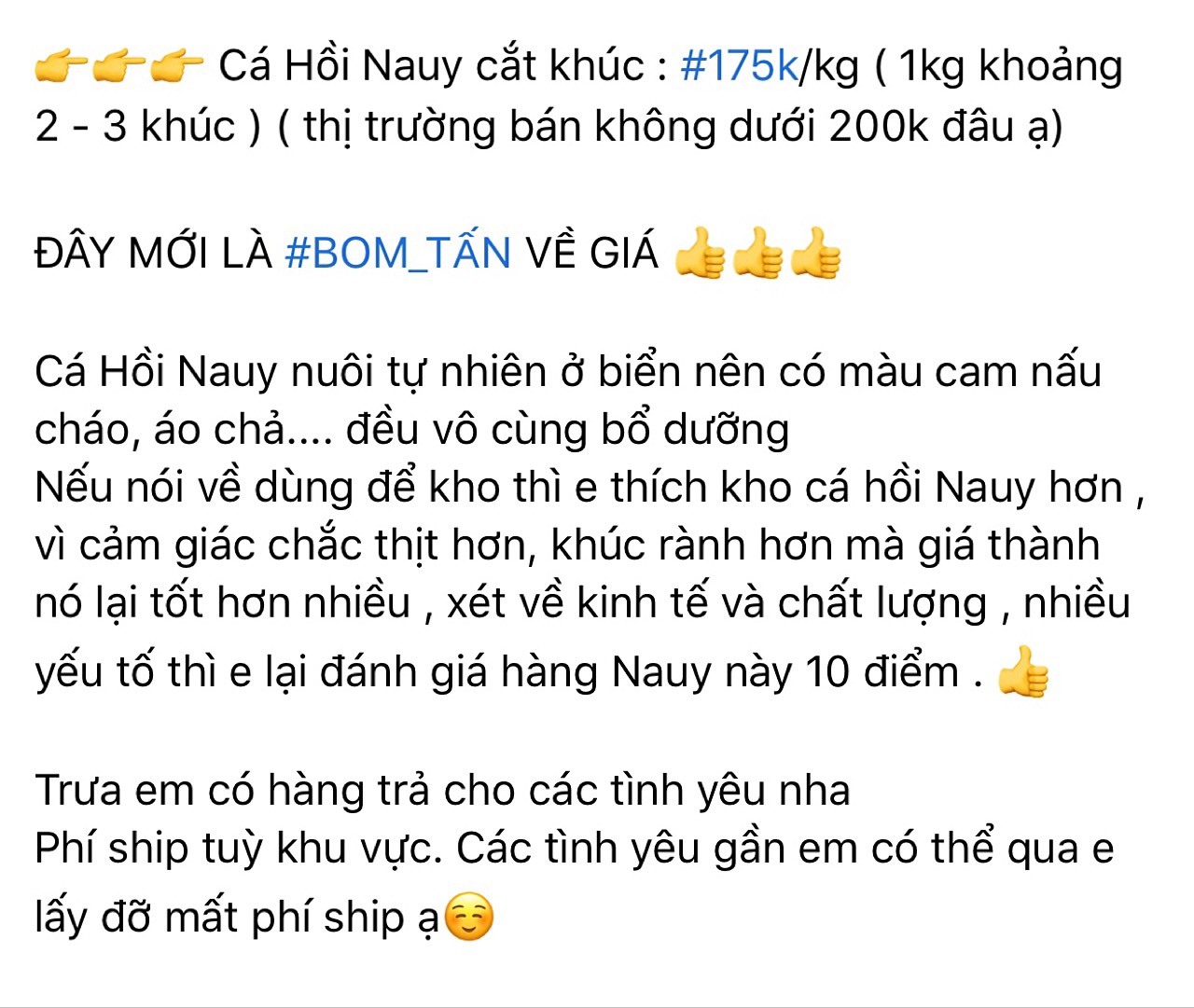 Theo quảng cáo của người bán, đây đều là hàng mới tươi ngon, do đầu mối đặt số lượng lớn nên có giá rẻ. Bên cạnh đó, do ảnh hưởng của dịch bệnh, cá hồi không xuất bán được nhiều. Có đợt hàng về lên đến cả trăm ký loại này.