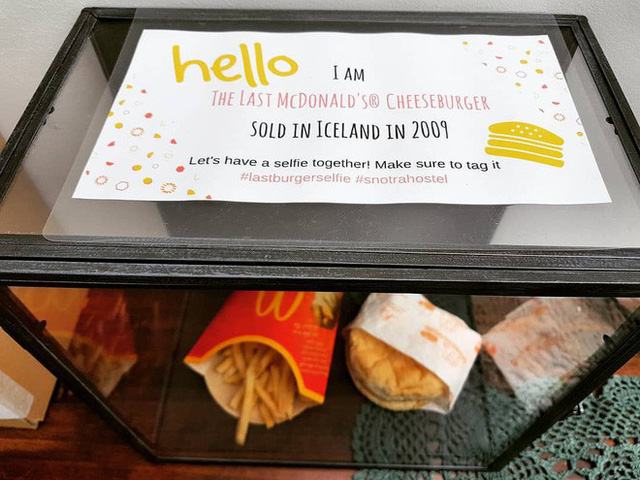 "Xin chào! Tôi là chiếc hamburger phô mai McDonald cuối cùng được bán tại Iceland vào năm 2009. Hãy selfie cùng tôi một tấm nhé! Và nhớ để hashtag #lastburgerselfie #snotrahostel nữa".
