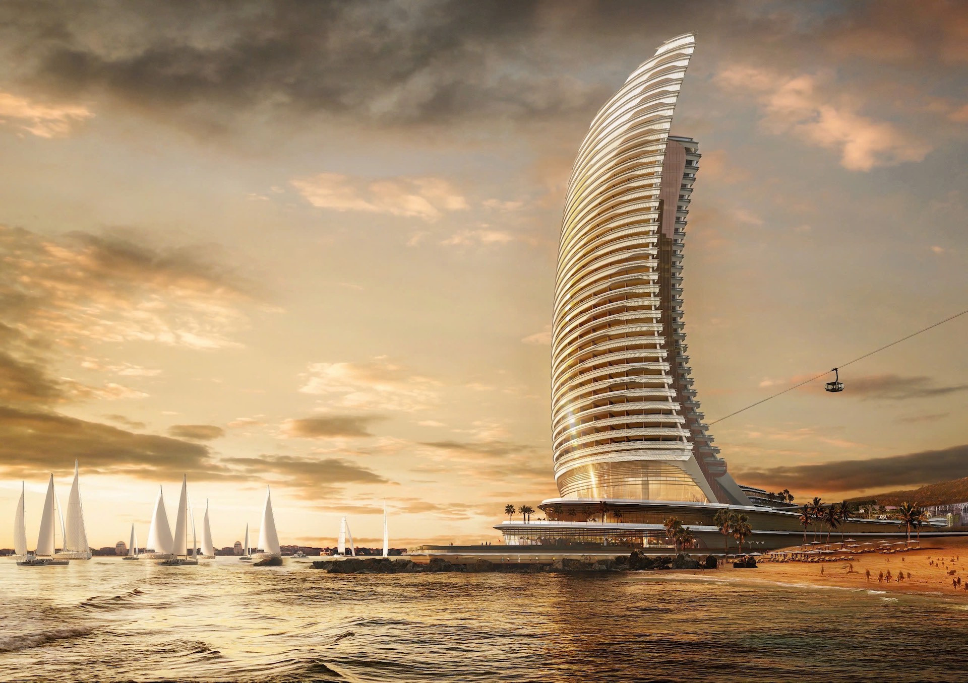 Trong đó, tòa tháp trung tâm với chiều cao 36 tầng, sẽ trở thành một tổ hợp nghỉ dưỡng - giải trí - thương mại xa xỉ gồm khách sạn The Luxury Collection Hon Thom, bể bơi vô cực, sky club... Đặc biệt, thiết kế các tầng trên cùng của tòa tháp được dành cho các nhà hàng sang trọng, quầy bar, quán café…, tạo không gian khoáng đạt đón hàng triệu du khách tới tham quan.