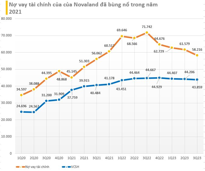 Tính đến cuối quý 3/2023, tổng nợ vay tài chính của Novaland ở mức 58.216 tỷ đồng, giảm hơn 6.000 tỷ đồng so với đầu năm và giảm gần 3.500 tỷ đồng so với cuối quý 2/2023. Trong đó, dư nợ trái phiếu là hơn 40.000 tỷ đồng, dư nợ ngân hàng là 9.053 tỷ đồng.