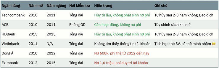 Techcombank và HDBank đã hủy tài khoản sau vài năm không phát sinh giao dịch nên không nợ nần gì.