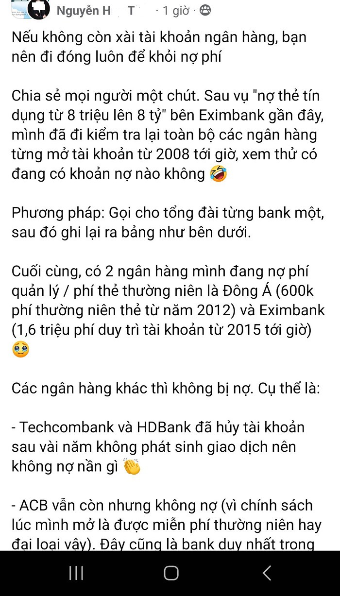 Cụ thể, trên một trang diễn đàn về tài chính cá nhân, tài khoản Nguyễn Huy T. chia sẻ: “Sau vụ "nợ thẻ tín dụng từ 8 triệu lên 8 tỷ" bên Eximbank gần đây, tôi cho rằng chuyện gì cũng có thể xảy ra. Do đó, để không muốn một ngày đẹp trời bản thân tiếp tục trở thành con nợ bất đắc dĩ của ngân hàng, mọi người cần lưu ý các dịch vụ mình đang sử dụng, trong đó đơn giản nhất là các tài khoản ngân hàng. Nếu không còn dùng tài khoản ngân hàng nào đó, tốt nhất các bạn nên đi đóng luôn để khỏi phát sinh các khoản nợ phí hoặc các rắc rối nếu có khác.