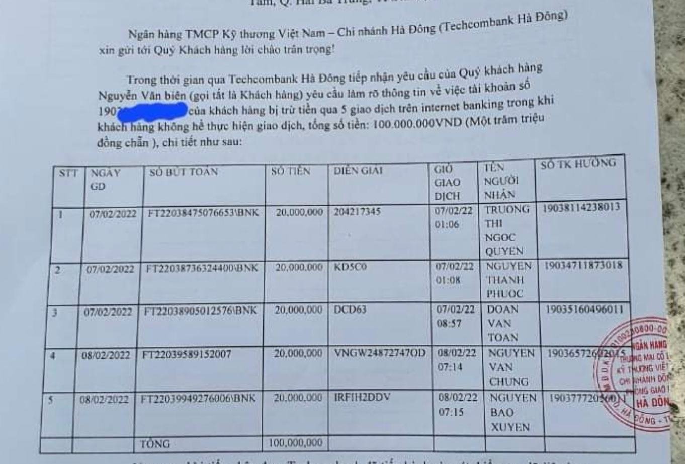 Ngày 18.2, trong phản hồi tới anh N.V.B, Ngân hàng TMCP Kỹ thương Việt Nam (Techcombank) chi nhánh Hà Đông cho hay, toàn bộ các giao dịch trên là giao dịch thành công và hợp lệ, "không có dấu hiệu gì bất thường từ các bên liên quan, và không ghi nhận lỗi từ dịch vụ của ngân hàng".