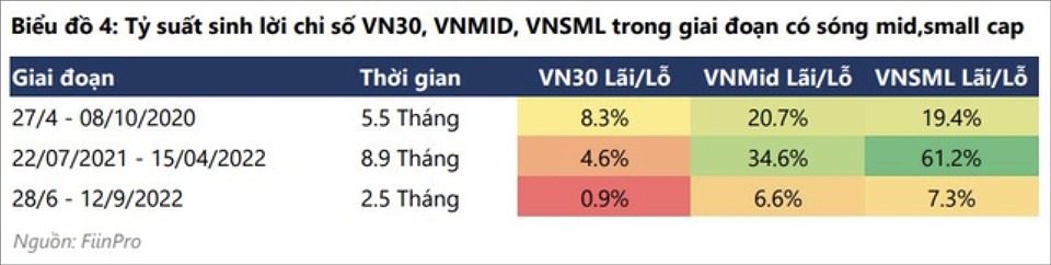 Trong 3 năm trở lại đây (2020 - 2022), mỗi năm đều xuất hiện một làn sóng nhóm cổ phiếu MIDCAP (nhóm vốn hóa vừa) và SMLCAP (nhóm vốn hóa nhỏ) khi VN-Index hay VN30-Index có dấu hiệu chững lại. Trong các đợt sóng kể trên, tỉ suất sinh lời của 2 nhóm vốn hóa vừa và nhỏ vượt trội hơn rất nhiều so với các chỉ số lớn như VN-Index hay VN30-Index.