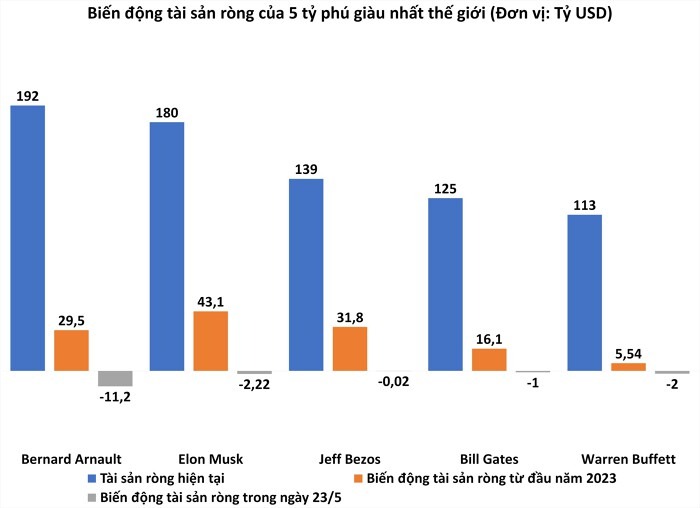 24/05/2023 17:01Tài sản của tỷ phú giàu nhất thế giới 'bốc hơi' hơn 11 tỷ USD trong một ngày