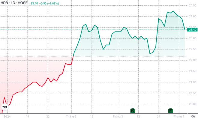 Cùng lúc đó, từ đầu năm đến nay, HDBank khởi sắc khi đón sóng mạnh mẽ cùng nhóm ngân hàng, cổ phiếu HDB tăng tích cực 17,6% giá trị, từ 19.900 đồng/cp (cập nhật phiên 2/1) lên 23.400 đồng/cp (cập nhật phiên 3/4).