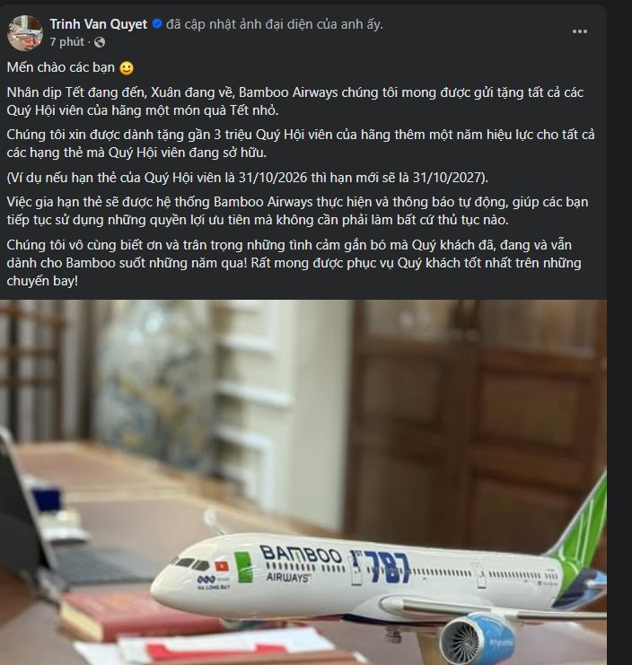 Trong thông báo đăng tải tối 9/2, ông Quyết cho biết Bamboo Airways sẽ gia hạn thẻ hội viên thêm một năm cho gần 3 triệu khách hàng của hãng.