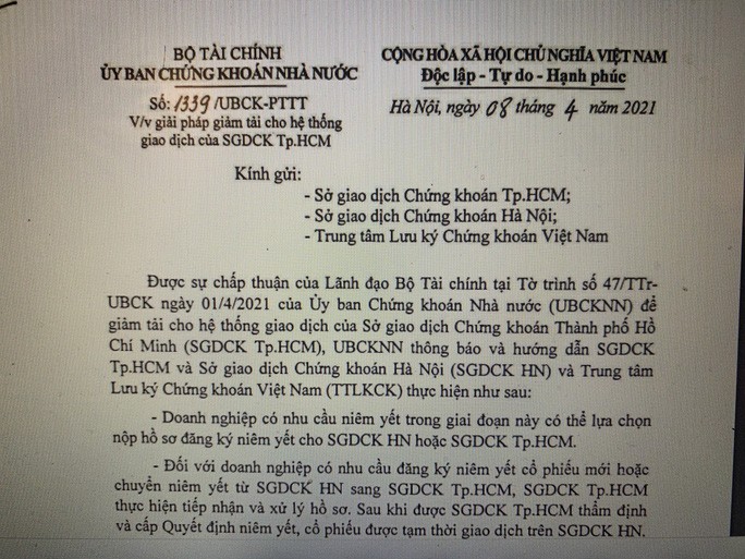 Chủ tịch Ủy ban Chứng khoán Nhà nước, ông Trần Văn Dũng, vừa ký công văn 1339, thông báo và hướng dẫn Sở giao dịch Chứng khoán TP HCM (HOSE), Sở Giao dịch Chứng khoán Hà Nội (HNX), Trung tâm Lưu ký Chứng khoán Việt Nam (VDS) về giải pháp giảm tải hệ thống giao dịch của HOSE.