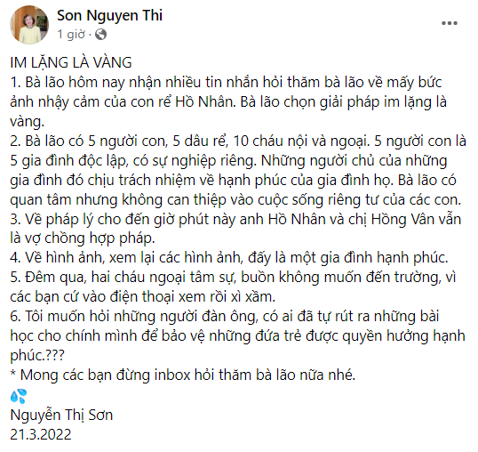 Theo dòng diễn biến, giữa những luồng tranh cãi trái chiều, bà Nguyễn Thị Sơn mẹ vợ của doanh nhân Hồ Nhân đã có những chia sẻ đầu tiên sau lùm xùm của con rể với tựa đề "Im lặng là vàng".