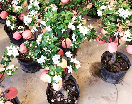 Những cây táo cảnh có quả được chọn ghép giá bán 3 triệu đồng/chậu đã được khách đặt mua. Ảnh: Văn Hiệu. |