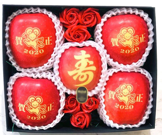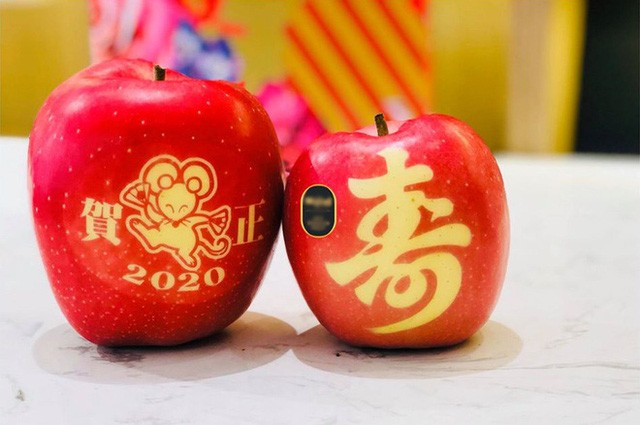 Ngoài trái cây nội khắc chữ, mùa Tết năm nay, thị trường còn có các loại táo Nhật in hình con chuột 2020, in chữ Lộc, Phát. Đến ngày 10/1, giá bán cao nhất là 790.000 đồng/trái.