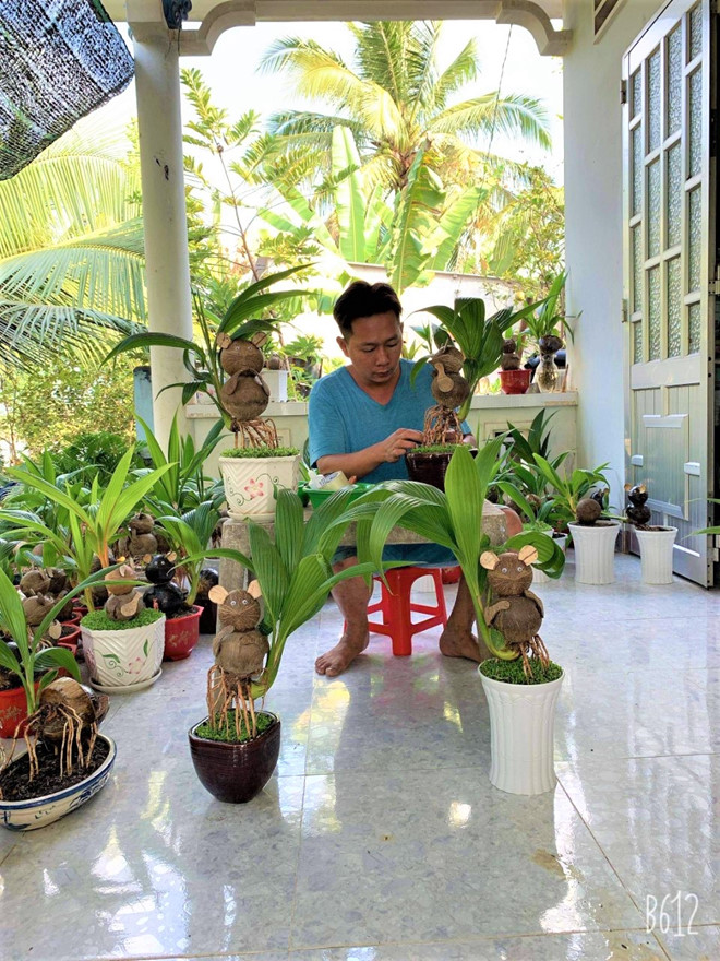 Trong khi đó, tại huyện Châu Thành, tỉnh Bến Tre, để phục vụ nhu cầu chơi Tết Canh Tý 2020, anh Lê Hồng Quân (34 tuổi) đã tạo hình khoảng 1.000 chậu bonsai dừa hình chuột độc đáo và lạ mắt.