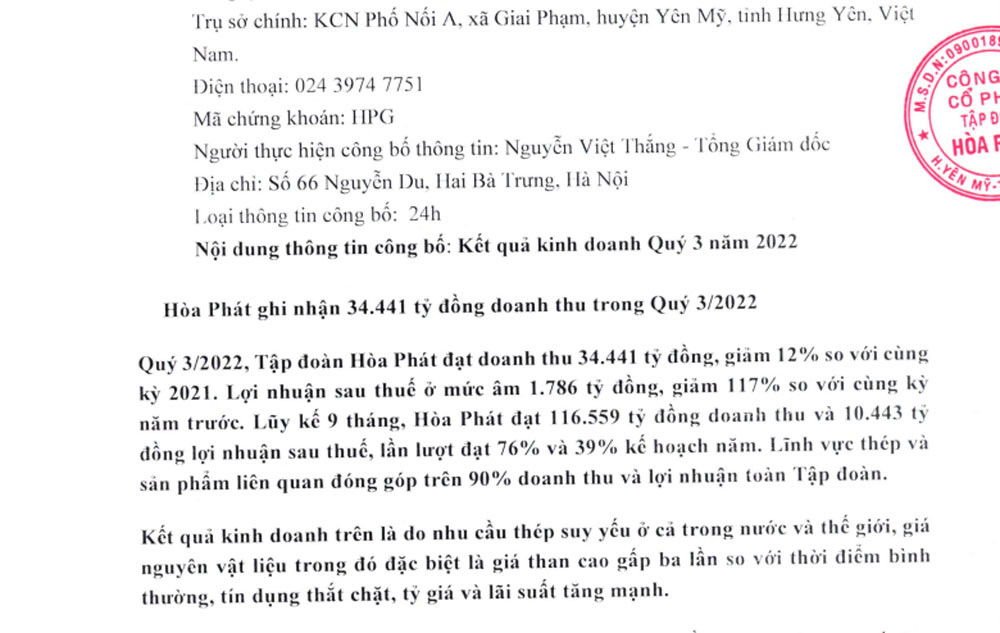 Tập đoàn Hoà Phát (HPG) của chủ tịch Trần Đình Long vừa công bố báo cáo tài chính quý III/2022 với doanh thu giảm 12% so với cùng kỳ, xuống 34.440 tỷ đồng, trong khi lợi nhuận sau thuế âm 1.786 tỷ đồng.