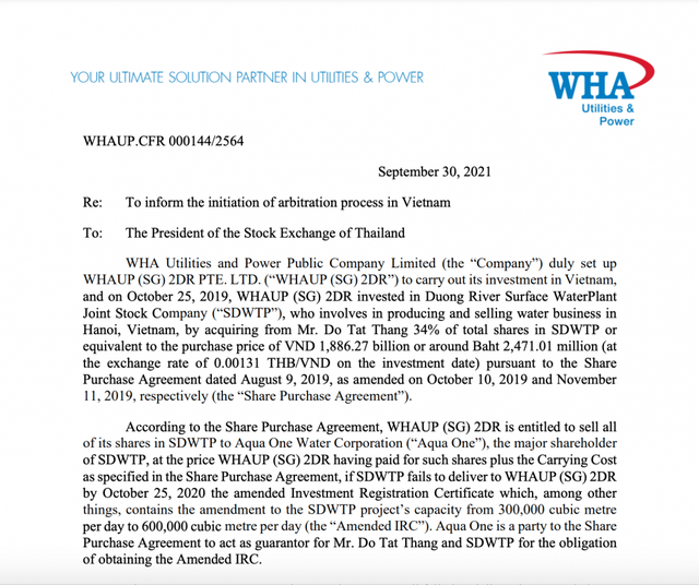 Tuy nhiên, tính đến thời điểm WHA gửi thông báo cho SET, Aqua One vẫn chưa thực hiện nghĩa vụ nêu trên theo quy định trong thỏa thuận để mua cổ phần từ WHAUP (SG) 2DR.