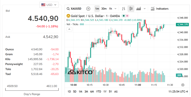 Theo cập nhật từ Kitco, giá vàng thế giới hôm nay 30/4/2026 vào lúc 5h00 (giờ Việt Nam) được ghi nhận ở mức 4.540,9 USD/ounce, giảm 54 USD, tương đương 1,18% so với phiên liền trước. Diễn biến này đánh dấu phiên giảm thứ ba liên tiếp của giá vàng thế giới trong bối cảnh thị trường tài chính quốc tế biến động mạnh.