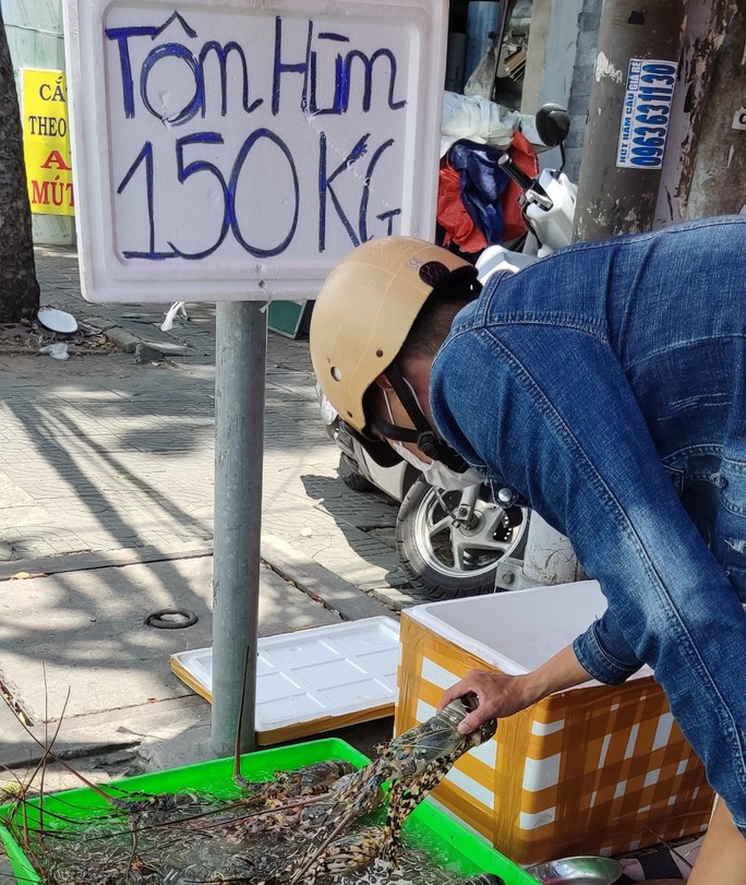 Tại một điểm bán trên đường Trường Chinh (quận Tân Bình), tôm hùm được ngâm trong nước đá, đựng trong thùng xốp và treo bảng giá "150KG" nên thu hút nhiều người đi đường ghé vào hỏi mua.