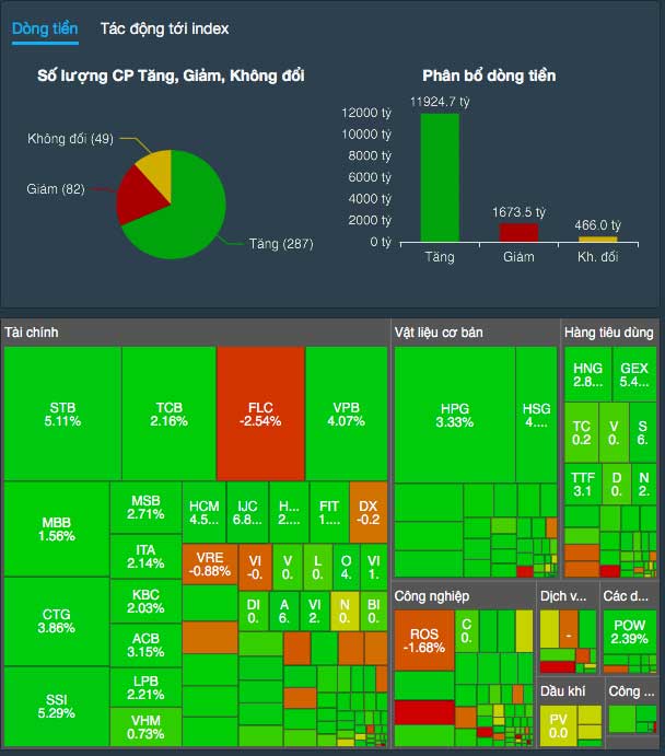 Trên sàn HoSE, ngoài nhóm vốn hoá lớn đóng góp tích cực cho chỉ số, thì một số midcap TEG, VCA, TCO, SBT, PHC, IJC, GTA cũng hoạt động hiệu quả, đồng loạt tăng trần. Khối ngoại tiếp tục mua ròng hơn 735 tỷ đồng, tập trung vào HPG, SSI, STB, VNM, GEX, MBB, NVL…