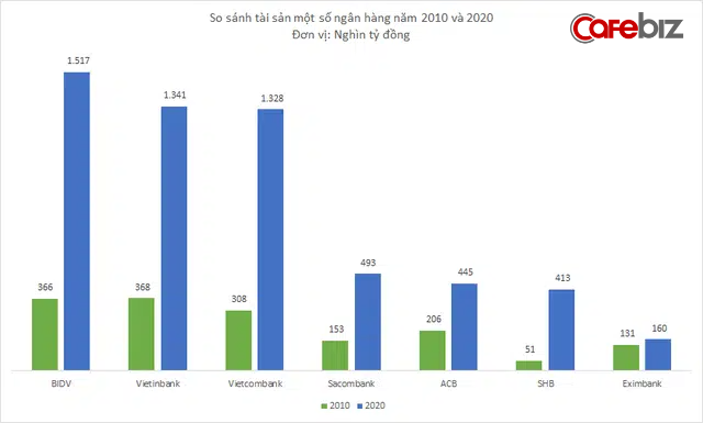 Đến năm 2020, cả ba vẫn dẫn đầu hệ thống ngân hàng, với quy mô tài sản đã vượt mức triệu tỷ. Trong đó, BIDV là nhà băng lớn nhất, đạt hơn 1,5 triệu tỷ đồng còn Vietinbank và Vietcombank cùng trên 1,3 triệu tỷ đồng.