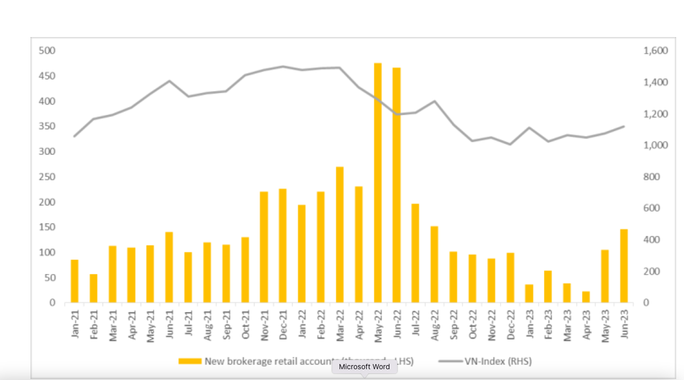 Đánh giá về sự bùng nổ tài khoản mở mới chứng khoán trong tháng 6, các chuyên gia phân tích của Công ty chứng khoán Maybank cũng cho rằng có sự cải thiện rõ rệt so với các tháng trước và mức mở mới này là khá kinh ngạc khi cao hơn nhiều tháng trong năm 2021, thời kì VN-Index tăng trưởng ấn tượng.