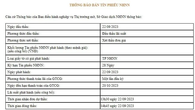Theo kết quả chào bán tín phiếu vừa được Ngân hàng Nhà nước công bố, phiên ngày 22/9, cơ quan này tiếp tục chào bán tín phiếu 28 ngày theo cơ chế đấu thầu lãi suất. Kết quả có 5 thành viên trúng thầu với tổng khối lượng là 10.000 tỷ đồng, lãi suất 0,5%.