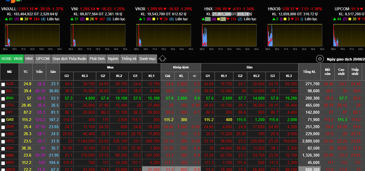 Mở cửa phiên giao dịch 29/8, hàng loạt cổ phiếu nhóm ngành giảm ngay từ đầu phiên khiến chỉ số VN-Index giảm hơn 17 điểm.