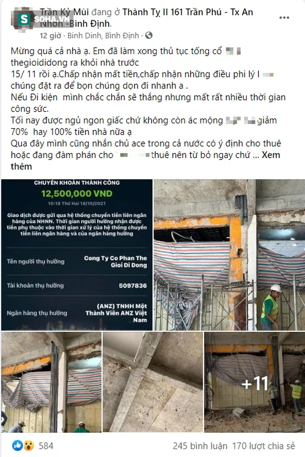 Cụ thể, vào ngày 19/10/2021 trên Facebook cá nhân, ông Trần Kỷ Mùi - chủ nhà cho Thế Giới Di Động (TGDĐ) thuê mặt bằng tại địa chỉ 160A Trần Phú, phường Bình Định, thị xã An Nhơn, tỉnh Bình Định cho biết: