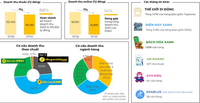 Cả năm 2023, Thế giới Di động đạt 118.000 tỷ đồng doanh thu hợp nhất, giảm 11% so với cùng kỳ năm 2022 và hoàn thành 88% kế hoạch đề ra từ đầu năm. Trong đó, doanh thu online đạt gần 17.000 tỷ đồng, giảm 11% và đóng góp 14% trong tổng doanh thu. Doanh nghiệp chưa công bố lợi nhuận. Đáng chú ý, MWG cho biết, tháng 12/2023, chuỗi cửa hàng Bách Hóa Xanh đã đạt mục tiêu hòa vốn. MWG kỳ vọng chuỗi này sẽ có lãi ròng trong năm 2024.