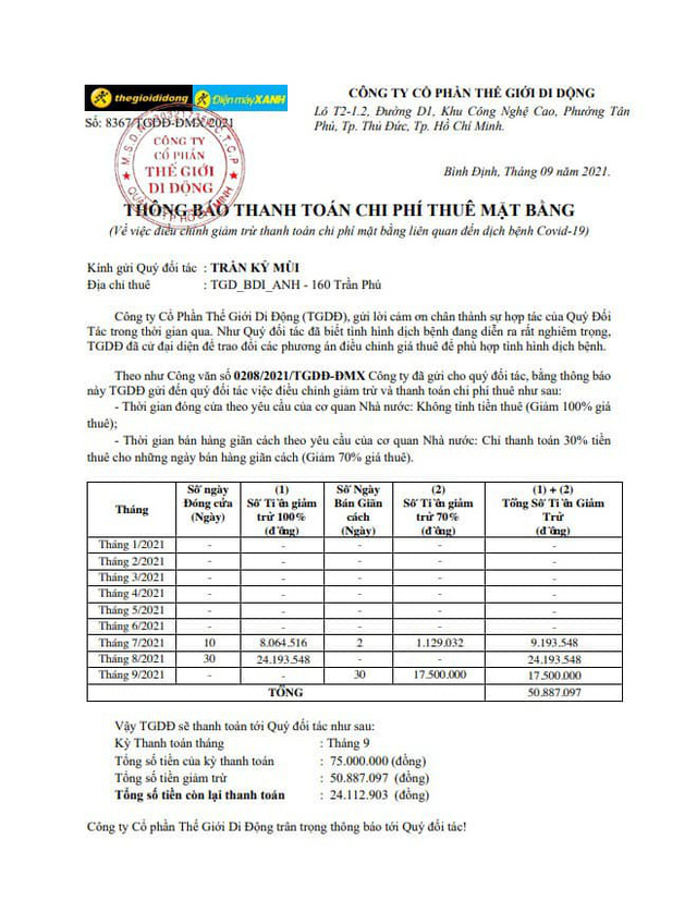 02/10/2021 22:21Thế giới Di động thông báo dừng trả tiền thuê mặt bằng các cửa hàng đóng cửa vì dịch, tự ý giảm tiền thuê dù chủ nhà chưa đồng ý?