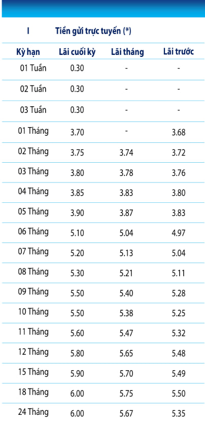 Theo biểu lãi suất huy động tiền gửi trực tuyến - sản phẩm có lãi suất cao nhất tại BVBank, lãi suất dành cho các kỳ hạn 1-5 tháng đồng loạt tăng thêm 0,3%/năm. Cụ thể, lãi suất kỳ hạn 1 tháng hiện ở mức 3,7%/năm, kỳ hạn 2 tháng là 3,75%/năm, kỳ hạn 3 tháng là 3,8%/năm, kỳ hạn 4 tháng là 3,85%/năm, và kỳ hạn 5 tháng là 3,9%/năm.