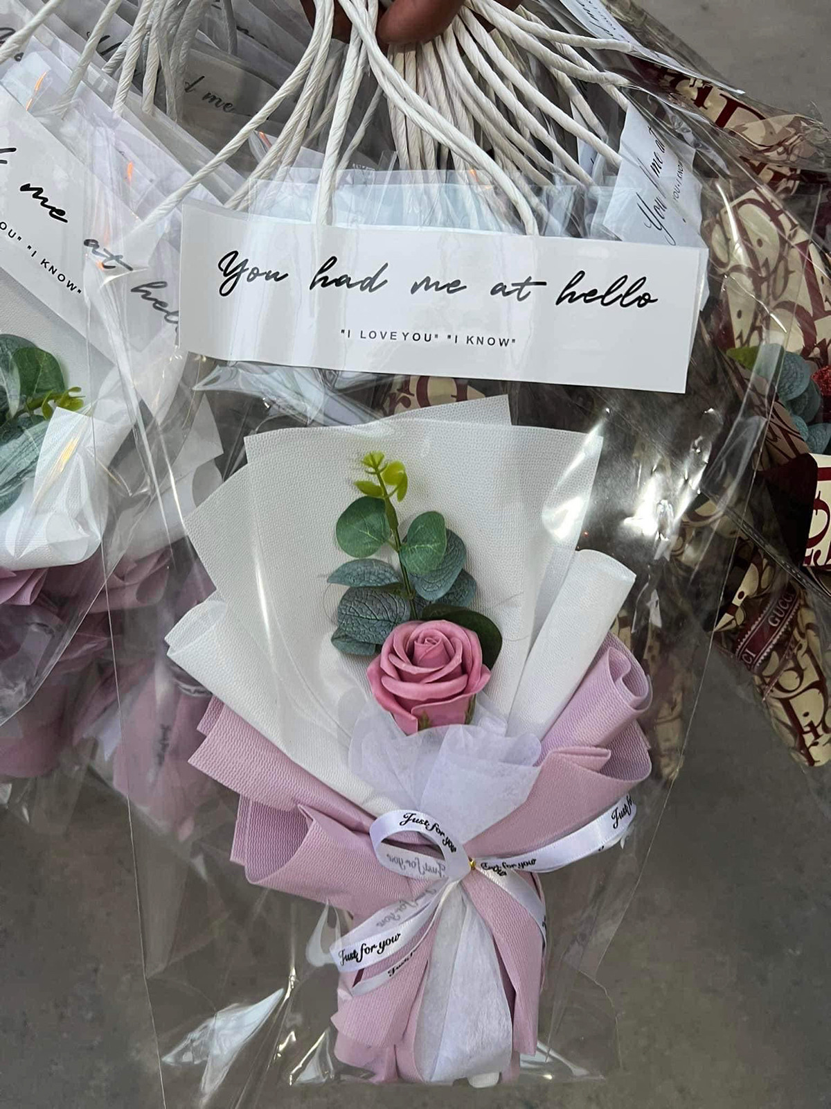 Cũng làm bó hoa 1 bông nhưng thay vì dùng hoa tươi, anh Ngọc Việt, đầu mối bán hoa ở Kim Giang (Thanh Xuân), lại làm hoa sáp với giá mức 30.000 đồng/bó bao gồm cả túi đựng. Anh bán theo set 90.000 đồng/3 bó cho khách sỉ và lẻ.