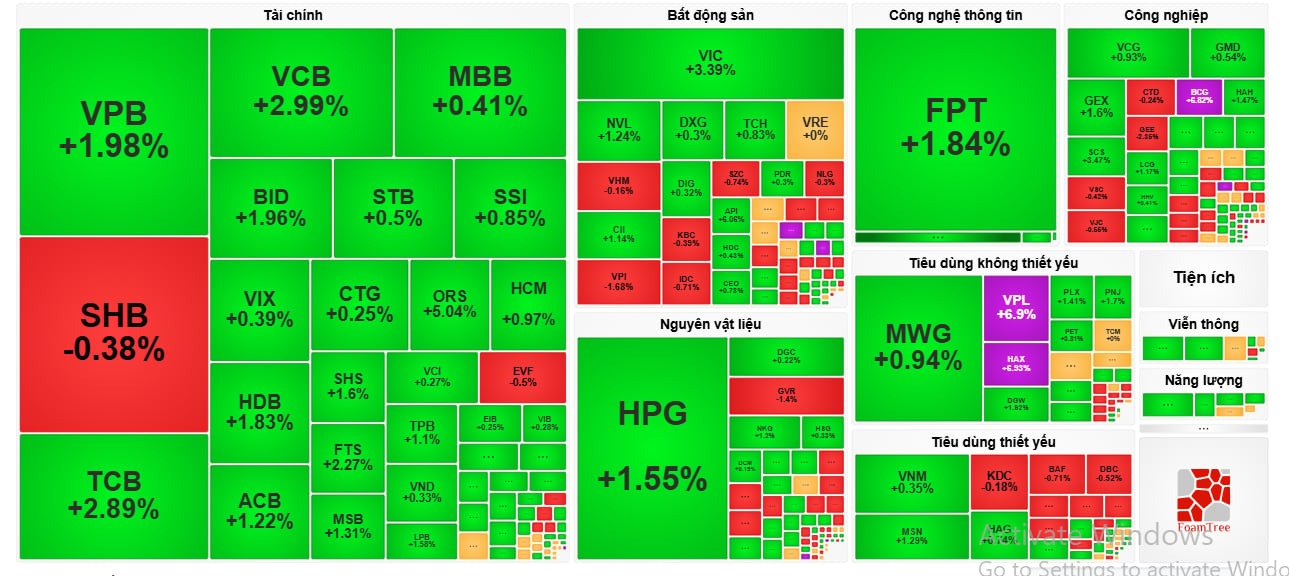 Sắc xanh tập trung chủ yếu ở nhóm tài chính, bất động sản, công nghệ thông tin và lan sang các ngành công nghiệp khác.