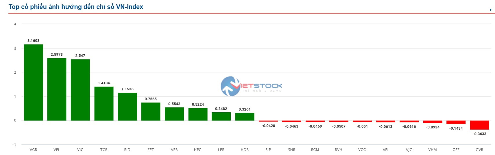 Trong top các cổ phiếu ảnh hưởng nhiều nhất đến chỉ số VN-Index, nhóm ngân hàng vẫn đang chiếm ưu thế khi có sự góp mặt của VCB, TCB, BID, VPB, LPB và HDB, riêng VCB của Vietcombank góp tới hơn 3,1 điểm cho chỉ số sàn HOSE.