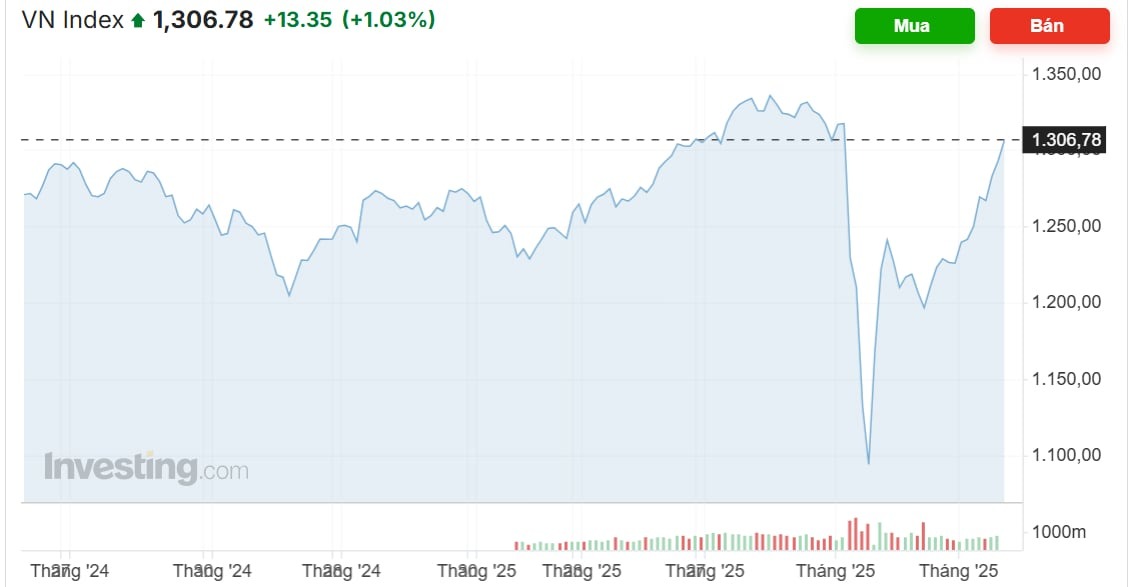 Lần gần nhất VN-Index chạm mốc 1.300 điểm là vào ngày 24/2/2025 - cao nhất gần 1.000 ngày.