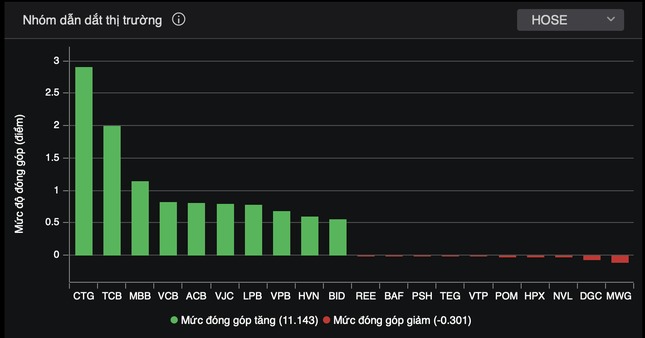 Thị trường chỉ thực sự “nổi sóng” khi cổ phiếu ngân hàng tăng mạnh trong phiên chiều. Nhóm dẫn dắt thị trường đa số là các mã nhà băng: CTG, TCB, MBB, VCB, ACB, LPB, VPB, BID… CTG có thời điểm đạt mức giá trần, dẫn đầu đà tăng với mức đóng góp gần 3 điểm, đồng thời giữ mức thanh khoản cao nhất toàn sàn 837 tỷ đồng.