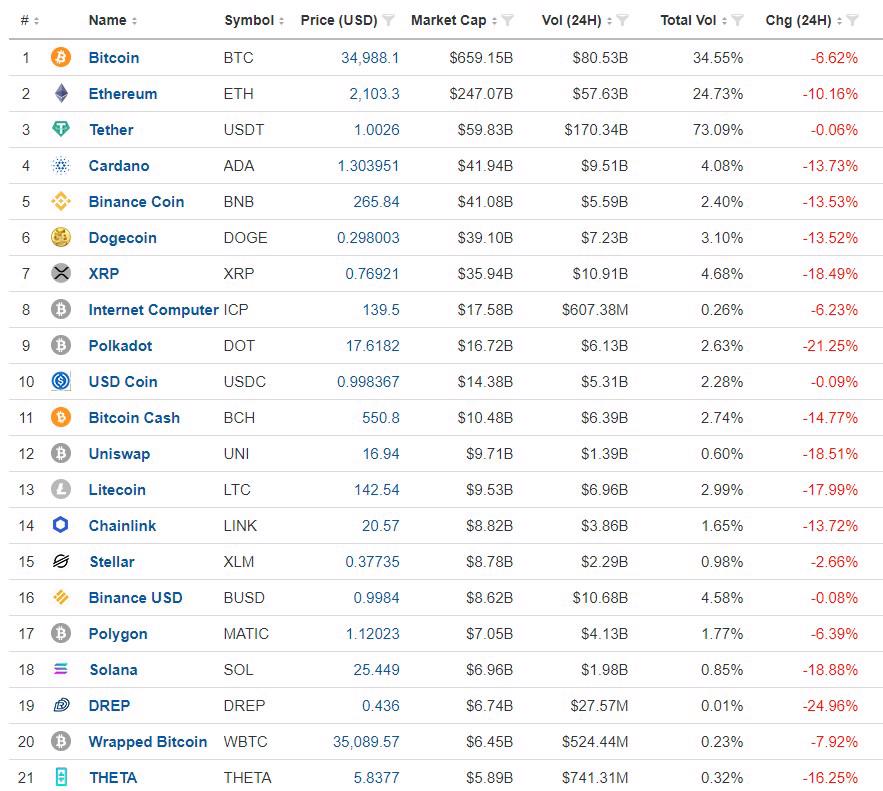 Sắc đỏ vẫn phủ khắp bảng giá tiền ảo vào sáng sớm nay (24/5) theo giờ Việt Nam. Lúc gần 7h, giá Bitcoin giảm gần 8% so với cách đó 24 tiếng, còn gần 34.700 USD. Mức giảm khoảng 10% cũng ghi nhận ở hầu hết các tiền ảo đình đám khác, như Ethereum, Dogecoin, Internet Computer…