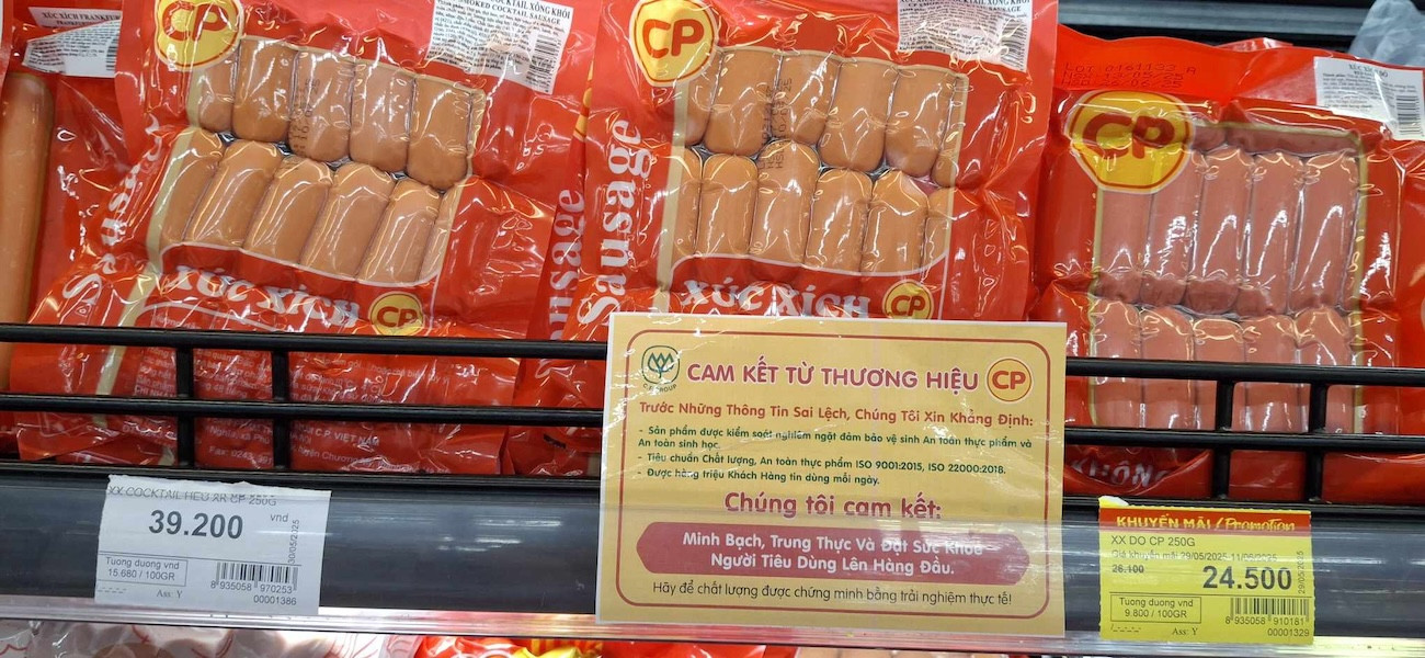 Điều khác biệt là tại các quầy hàng, C.P có dán thêm tờ thông báo với nội dung thể hiện "Cam kết từ thương hiệu CP".