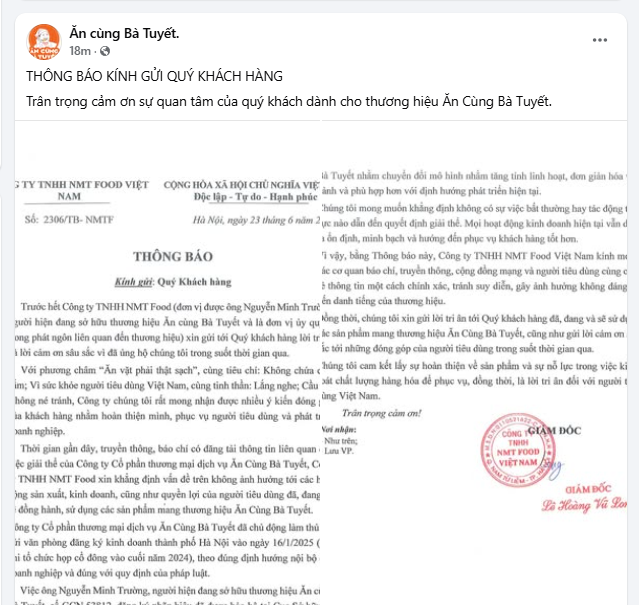 Được biết, Công ty Cổ phần thương mại dịch vụ Ăn Cùng Bà Tuyết đã chủ động làm thủ tục gửi văn phòng đăng ký kinh doanh thành phố Hà Nội vào ngày 16/1/2025 (sau khi tổ chức họp cổ đông vào cuối năm 2024), theo đúng định hướng nội bộ của doanh nghiệp và đúng với quy định của pháp luật.
