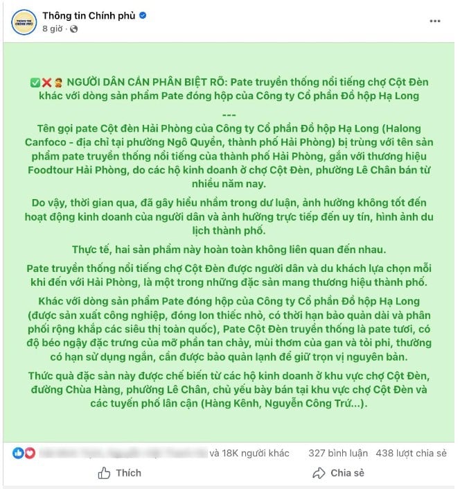 26/01/2026 10:12Thông tin Chính phủ cảnh báo người dân về "Pate Cột Đèn Hải Phòng" chính gốc và pate công nghiệp
