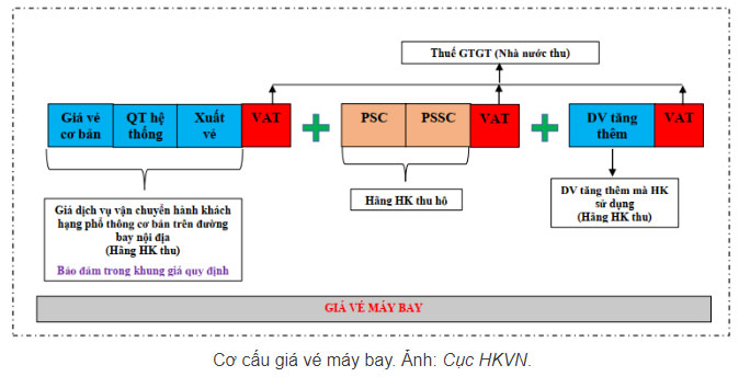 Trao đổi với PV Tiền Phong, lãnh đạo Cục Hàng không Việt Nam cho hay hiện giá vé máy bay được cấu thành bởi 4 yếu tố gồm: Giá dịch vụ vận chuyển hành khách hạng phổ thông cơ bản trên đường bay nội địa, thuế giá trị gia tăng (VAT), các khoản thu hộ doanh nghiệp cung ứng dịch vụ nhà ga hành khách và dịch vụ bảo đảm an ninh (gồm giá phục vụ hành khách và giá đảm bảo an ninh hành khách, hành lý) và giá dịch vụ đối với các hạng mục tăng thêm theo nhu cầu (chỗ ngồi, mua thêm hành lý ký gửi, chọn suất ăn, bảo hiểm du lịch... do hãng quyết định).