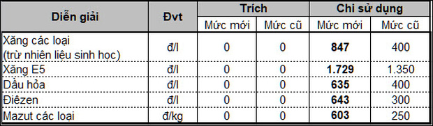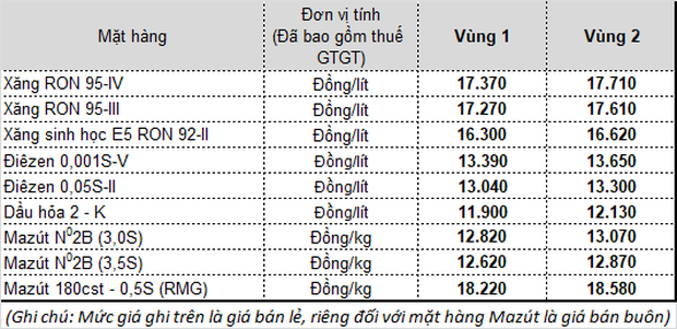 Sau khi trích lập, giá bán lẻ xăng dầu trong nước xăng E5 RON 92 không cao hơn 16.309 đồng/lít, xăng RON 95-III không cao hơn 17.270 đồng/lít, dầu diesel 0.05S không cao hơn 13.042 đồng/lít, dầu hỏa không cao hơn 11.908 đồng/lít và dầu mazut 180CST 3.5S không cao hơn 12.622 đồng/kg.