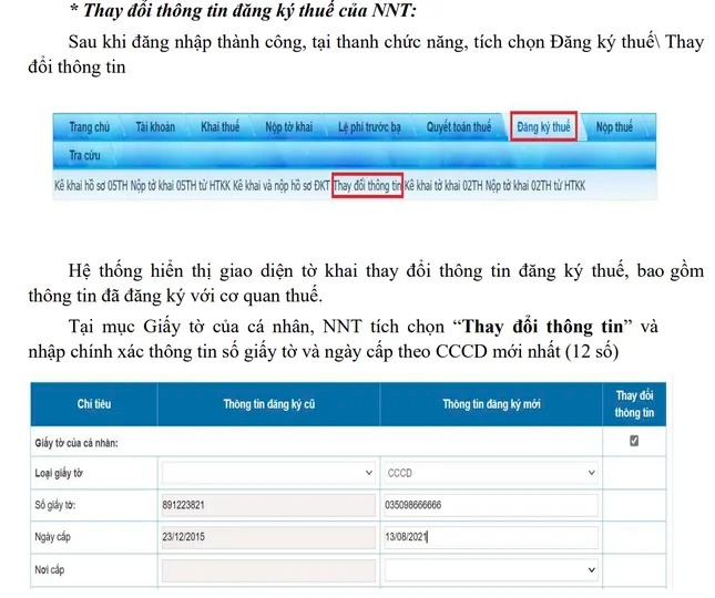 Tại Cổng dịch vụ công quốc gia, người nộp thuế truy cập dichvucong.gov.vn, tìm thủ tục “Thay đổi thông tin đăng ký thuế”. Cổng Thông tin điện tử ngành Thuế thuedientu.gdt.gov.vn, người dùng chọn “Cá nhân”, đăng nhập và cập nhật.