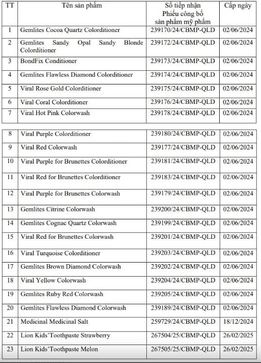 Theo đó, đối với Công ty TNHH Phát Anh Minh (Thanh Trì, Hà Nội) Cục Quản lý Dược đình chỉ lưu hành, thu hồi trên toàn quốc đối với 23 sản phẩm. Trong số này có các loại dầu xả Gemlites Cocoa Quartz Colorditioner, BondFix Conditioner, Viral Rose Gold Colorditioner. Ngoài ra còn có kem đánh răng Lion Kids' Toothpaste Strawberry, Lion Kids'Toothpaste Melon, Viral Hot Pink Colorwash, Medicinal Salt...