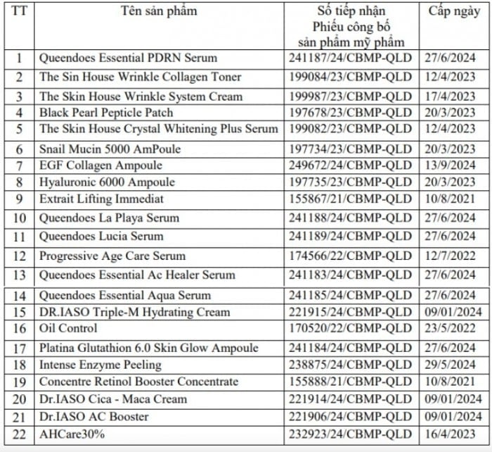 Trong số đó có các sản phẩm: Queendoes Essential PDRN Serum, The Skin House Essential Wrinkle Collagen Toner, The Skin House Wrinkle System Cream, Black Pearl Peptide Patch, The Skin House Crystal Whitening Plus Serum, Snail Mucin 5000 Ampoule, EGF Collagen Ampoule, Hyaluronic 6000 Ampoule, Extrait Lifting Immediat, Queendoes La Playa Serum, Queendoes Lucia Serum, Progressive Age Care Serum, Queendoes Essential AC Healer Serum, Queendoes Essential Aqua Serum, DR.IASO Triple-M Hydrating Cream, Oil Control Cream, Platina Glutathion 6.0 Skin Glow Ampoule, Intense Enzyme Peeling, Concentre Retinol Booster Concentrate, Dr.IASO Cica-Maca Cream, Dr.IASO AC Booster, AHCare30%.